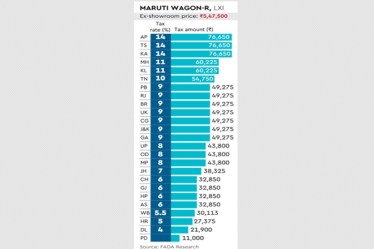 Let’s take the example of Maruti Suzuki Wagon R, which was India’s highest-selling car in FY22. While the ex-showroom price of the Wagon R LXi variant is Rs 547,500, the road tax in Andhra Pradesh, Telangana and Karnataka is Rs 76,650 and thus the on-road price is Rs 668,784. In Puducherry, on the other hand, the road tax is just Rs 11,000 and the on-road price is Rs 588,108.