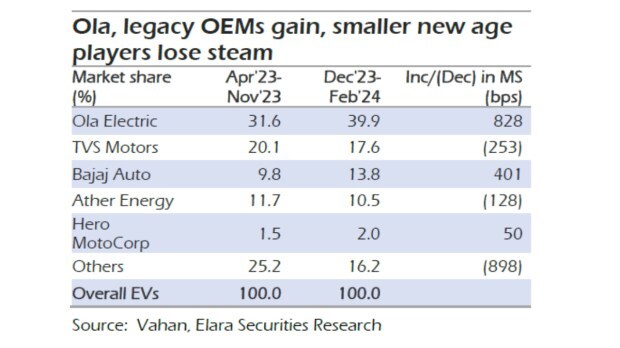 Ola Electric’s electric two-wheeler market share has seen growth from 31.6 percent in the April to November 2023 period, to around 40 percent in the December to February 2024 period says a report by Elara Securities India.