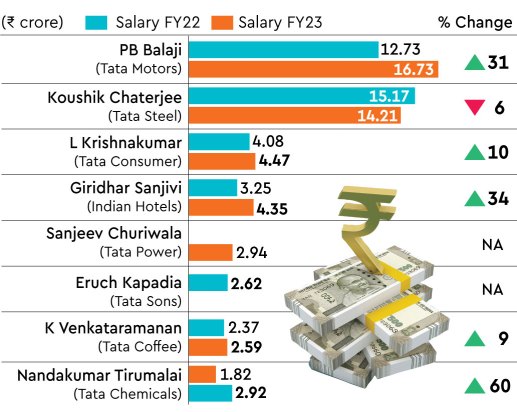 While Balaji made it to the top spot, Giridhar Sanjivi, CFO of Indian Hotels Company (IHCL), logged the highest increase in remuneration within the group. Following a return to profit after a gap of three years, IHCL — the owner of the Taj brand of luxury hotels — rewarded Sanjivi with a 34% increase in salary to Rs 4.35 crore in FY23 compared to FY22.