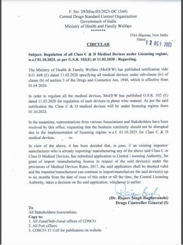 In a notification dated 12 October 2023, the drug regulator said that “if an existing importer/manufacturer who is already importing/manufacturing Class C or Class D medical devices, has submitted an application to Central Licensing Authority, for grant of import/manufacturing license in respect of the said device(s) under the provisions of Medical Devices Rules, 2017, the said application shall be deemed valid and the importer/manufacturer can continue to import/manufacture the said device(s) upto six months from the date of issue of this order or till the time, the Central Licensing Authority, takes a decision on the said application, whichever is earlier.”