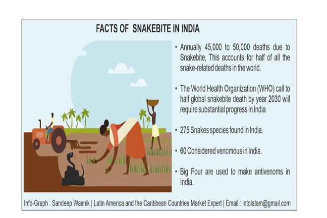 In India, every year between 45,000 to 50,000 people die because of snake bites and others are left with amputations and permanent disabilities. These mortality figures show that the snakebites in India are half of all the snake-related deaths in the world. The World Health Organization (WHO) has called for half global snakebite deaths by 2030 and this will require substantial progress in India. In India, Snakebite has remained a much-neglected subject in spite of the significant mortality and morbidity it causes.