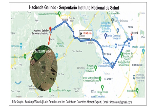 The Serpentario del Instituto Nacional de Salud(English: Serpentarium of the National Health Institute) is located at Hacienda Galindo, which is nearly 35 km away from Bogota (Capital of Colombia)in the municipality of Bojacá -Cundinamarca, it keeps in captivity poisonous snakes of the two families of medical importance in Colombia: Viperidae and Elapidae, species from all the biogeographic regions of the country, which are destined to obtain their poisons, which are in practice the first and fundamental input for the production of the anti-venoms produced by the INS. Hacienda Galindo is of 70-hector area and maintaining 40 to 45 horses to obtain hyper immune plasma (Plasma production is achieved through controlled and successive injections of poisons into healthy horse according to the immunization program) after 2 or 3 month by injecting the precisely measured mixture of venoms, such activities are aligned with the World Health Organization guidelines.