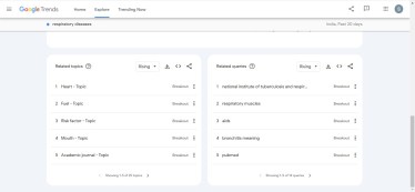 According to Google Trends, people also searched for Related Queries like national institute of tuberculosis and respiratory diseases new delhi, respiratory muscles, pubmed, types of respiratory diseases and respiratory problems.