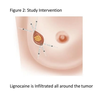 Half of these participants, including the control group, received standard surgery followed by standard postoperative treatment like chemotherapy, hormone therapy and radiotherapy as per guidelines. Meanwhile, the other half, constituting the intervention group, received an injection of a commonly used local anaesthesia agent, 0.5% lidocaine, all around the tumor, just before surgery. After this, these patients underwent standard surgery followed by the same postoperative treatment as was given in the control group.