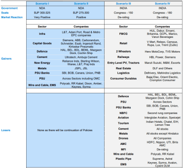 If NDA comes back to power, it added, there will be continuation of policy and themes around infrastructure, defence, CG, new energy, tourism, etc. will continue to do well. Consumer, 2-wheelers and tractors can get a boost from green shoots in rural demand and expectations of normal monsoons.