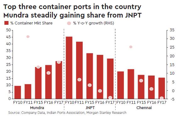 Ports operators are in a relatively sweet spot: The Morgan Stanley global economics team expects a synchronous recovery in domestic demand in DMs and EMs for the first time since 2010 which would help revive EM Asia’s exports meaningfully in 2017-18 relative to 2012-16. Our India economist expects 12.5%/12.4% y-o-y rises in exports in FY18/FY19 versus a rise of 5% in FY17 and 14.5%/15.3% rises in imports in FY18/FY19 versus a 1% decline in FY17, indicating an improving trade environment for India. An improving macro environment bodes well for port volumes: Historically global seaborne traffic growth has enjoyed a 1.0x multiplier with global real GDP growth while India has historically enjoyed a higher multiplier (at 1.1x). The global trade recovery is propping up core organic growth at key ports in India. According to our global shipping analyst, global trade continues to improve significantly, with container port traffic growth rising by 7.4% in Q2. Positive growth was noted across every market, led by South Asia. The momentum is expected to hold in 2H, with July also showing strong growth.