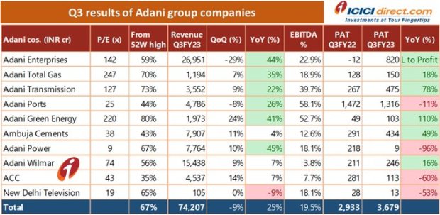 Adani Ports and SEZ reported a decline of 16% in its profit, amounting to Rs 1,315 crore in Q3FY23. Adani Power also witnessed a dip of 96%, with profits totaling Rs 8.7 crore. On the other hand, Adani Enterprises turned a profit on-year, with earnings of Rs 820 crore compared to a loss of Rs 12 crore in Q3FY22. Adani Green Energy, Adani Total Gas, and Adani Wilmar also recorded a profit, with increases of 110%, 17%, and 16%, respectively.