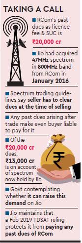 However, officials said they may look at claiming around Rs 13,000 crore of the total dues of the company from RJio which bought around 47.50 MHz spectrum in the 800 MHz band from RCom through trading in January 2016. The spectrum was acquired across 13 circles and is currently being used by Jio to provide 4G services.