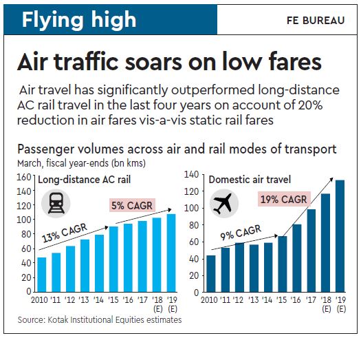 Air travel has significantly outperformed long-distance AC rail travel in the last four years on account of 20% reduction in air fares vis-a-vis static rail fares.