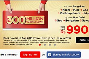 AirAsia India offer says all-in-fares have been slashed to as low as Rs 990 to celebrate the group having achieved the 300 mn passengers flown mark – the AirAsia Group reached the mark today.
