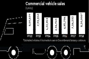 Binaifer Jehani, director, Crisil Research, says she expects the momentum from January to continue for both light commercial vehicles (LCVs) and medium and heavy commercial vehicles (MHCVs) during February and March. She added, “CV sales in FY18 is expected to surpass eight lakh units which was last seen in FY12. Basis the expectation for growth in February and March, we expect this mark to be breached with ease.”