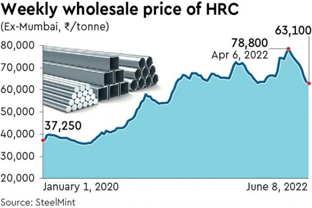 However, as a fall-out of the Russia-Ukraine war that started in late February, domestic steel prices started falling after reaching its peak in the first week of April. As on June 8, HRC prices in the wholesale market of Mumbai stood at Rs 63,100 a tonne.