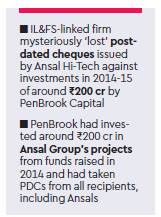 Last year, PenBrook (Peninsula Brookfield) Capital, an India-focused real estate fund, discovered that another IL&FS-linked firm had mysteriously “lost” post-dated cheques (PDCs) issued by Ansal Hi-Tech against investments in 2014-15 of around `200 crore by PenBrook, sources have confirmed to The Indian Express.