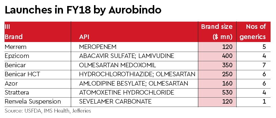 FY18 has seen the two key investor concerns on Aurobindo — (i) R&D quality and (ii) lack of significant launches — getting addressed. It has launched three key products in Q1, driving a 5% FY18e EPS upgrade. The launches also underscore ARBP’s R&D quality and improve confidence for other key launches including Renvela tabs. Aurobindo’s deeper, better quality filings and cost leadership position it well to overcome the US pricing challenge. Retain Buy. 3 key launches in Q1FY18: ARBP has in Q1FY18YTD launched 7+ products (vs 5 in Q4FY17) including 3 complex products — Meropenem, Strattera and Renvela suspension. Two of these were positive surprises in terms of competition (4 generics in Strattera vs JEFe of 7-8) and timing (Renvela suspension Q1FY18 launch vs JEFe Q4FY18). Approval pace also remains one of the highest among peers with 16 approvals in FY18YTD.