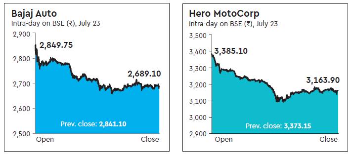 A possible price war between Bajaj Auto and Hero MotoCorp sent their stocks sharply lower on Monday. Analysts expressed concerns that Bajaj Auto’s strategy to gain a more significant share of the low-cost two-wheeler market would heighten competition and hurt the profit margins of both companies.