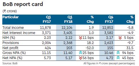 Bank of Baroda on Friday reported a 52% year-on-year drop in its net profit at Rs 203.39 crore in the April-June quarter, hurt by higher provisions for bad loans. On a sequential basis, the net profit rose 31.5%. Net interest income, which is the difference between income earned and income expended, stood at Rs 3404.95 crore, up 1% from the corresponding period last year and down 5% sequentially.