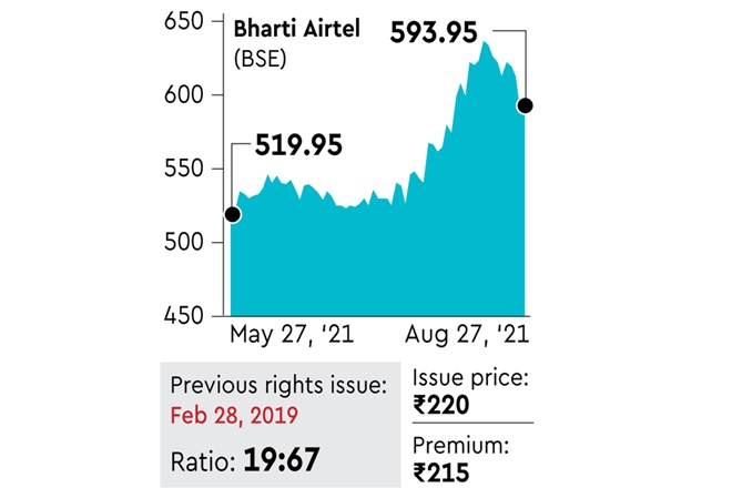Bharti Airtel will raise up to Rs 21,000 crore through a rights share offering, the telecom operator said on Sunday after it board okayed the issue at Rs 535 apiece, including a premium of Rs 530 per share. The shares will be issued in the ratio of 1 for every 14 held. The promoter and promoter group will not just subscribe to shares they are entitled to but also pick up any unsubscribed shares.
