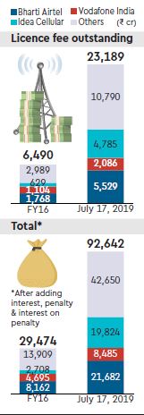How a long-running case can keep on adding to the amount can be gauged from the fact that in 2016 the outstanding licence fee dues as per DoT’s methodology, including interest, penalty, and interest on penalty, stood at Rs 29,474 crore.