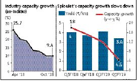 Unable to cope with falling yields, all airlines except IndiGo are slowing down. While IndiGo topped up capacity by 30% year-on-year in October, the increase for the rest of the sector was a shade above 9% y-o-y. This was way slower than the 18.9% y-o-y rise seen in June and 12.3% y-o-y in August.
