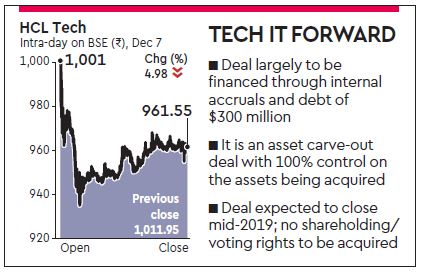 A large portion of the deal will be funded through internal accruals along with a debt of $300 million. The transaction is expected to close by mid-2019. However, the market was not enthused with the deal and HCL Technologies shares closed down 4.98% at Rs 961.55 on BSE. In the intra-day trade, it fell 7.7% to Rs 935 after the deal was announced.