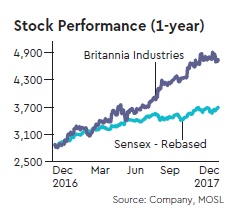 We are enthused with BRIT’s consistent healthy performance in a difficult operating environment. Rapidly expanding distribution, continuing investment in R&D and significant expansion of its own manufacturing indicate management’s optimism about the growth prospects. LUPs of premium products continue to receive good response, aiding volume growth substantially. Opportunity beyond biscuits is also substantially high. Continuing premiumisation, significant incremental cost savings and a favourable commodity cost outlook mean that 15% Ebitda margin is now achievable. We reiterate our Buy rating with a revised target price of Rs 6,100 (48x December 2019e EPS, a 20% premium to three-year average due to improving visibility on both volume recovery and margin growth).