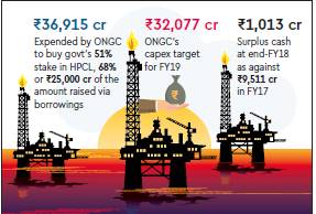 According to official sources, the government has chosen to give ONGC a reprieve for this year from both the commitments, considering that it also had to shoulder the yoke of boosting the government’s ‘disinvestment receipts last fiscal by purchasing its 51% stake in oil retailer HPCL for Rs 37,000 crore. A zero-debt company till FY17, ONGC borrowed about Rs 25,000 crore in March 2018 to fund its acquisition of HPCL while it also dipped into its reserves and surplus for about Rs12,000 crore. After the transaction, ONGC’s surplus cash has depleted to a little over Rs 1,000 crore at FY18-end from over Rs 9,500 crore at FY17-end. The special buyback/bonus share waiver for ONGC comes at a time the explorer is also staring at the possibility of being asked by a fiscally wary government to again share the oil subsidy burden if crude prices surge beyond a certain level.