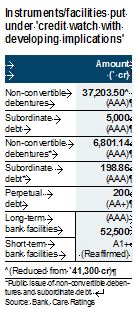 Care’s action applies to the Indiabulls Housing’s non-convertible debentures (NCDs) worth `37,203 crore, subordinate debt worth `5,000 crore, publicly-issued NCDs worth `6,801 crore, publicly-issued subordinate debt worth `199 crore, perpetual debt worth `200 crore and part of its bank facilities worth `52,500 crore.