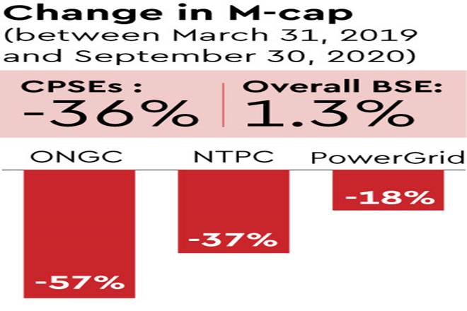 The market capitalisation of listed CPSEs (about 58 of them) stood at Rs 8.8 lakh crore on September 30, 2020, down 36% from Rs 13.71 lakh crore on March 31, 2019. During the same period, the BSE M-cap rose 1.3%. In fact, the M-cap of all the listed CPSEs was 42% lower than that of Reliance Industries (Rs 15.2 lakh crore) alone as on September 30, 2020.