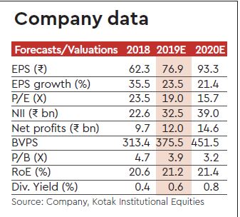 Tweak estimate: We are raising our estimates by 1-5% to factor recent business trends and changes due to Ind-AS. Post the revision, we expect the company to deliver 24% EPS CAGR during FY19-21e and medium-term RoE of 21-22%. While we like the franchise, we await better entry points to get into the stock; moderation in its business momentum and NIM pressure will open up better entry points, we believe.