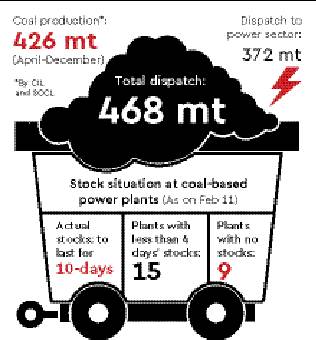 As on February 11, 113 power plants with coal linkages monitored by the Central Electricity Authority (CEA) had coal stocks that were sufficient to sustain for only 10 days. Stocks at thermal power plants across the country had suddenly fallen in August-November, with the surge in demand from some power stations, including a few of NTPC. That wind, nuclear and hydel plants with a combined capacity of 4 gigawatts were not able to generate power due to climatic and maintenance issues aggravated the crisis.