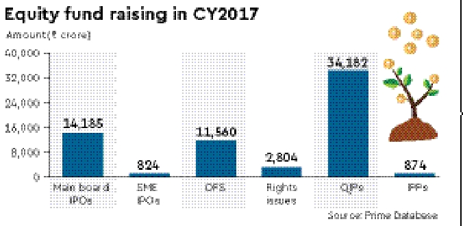 Companies and financial institutions have mopped up close to Rs 64,429 crore in 2017 so far with the government raising Rs 9,193 crore through a share sale in power utility NTPC. The amount raised in 2017 is about 37% higher than the Rs 46,733 crore raised in 2016. Market participants say the fund raising through equities could cross `1 lakh crore by the end of the year.