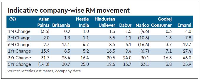 Though crude has seen a sharp correction in the last 1 month, crude linked RMs will take some time to reflect in terms of price correction. Overall Jefferies RM basket inched up 1% m-o-m largely led by mix of food and non food RMs. Within non crude, food based RMs, coffee saw sharp uptick of 14.5% m-o-m, Mentha rose by 7.2% m-o-m, barley increased by 6.1% m-o-m. Within crude linked RM basket, LLP rose sharply by 10% m-o-m, while crude corrected by 9% m-o-m during October month (corrected further in November). Palm oil sustained its corrective trend, down 3% m-o-m and 23% in last 1 year.