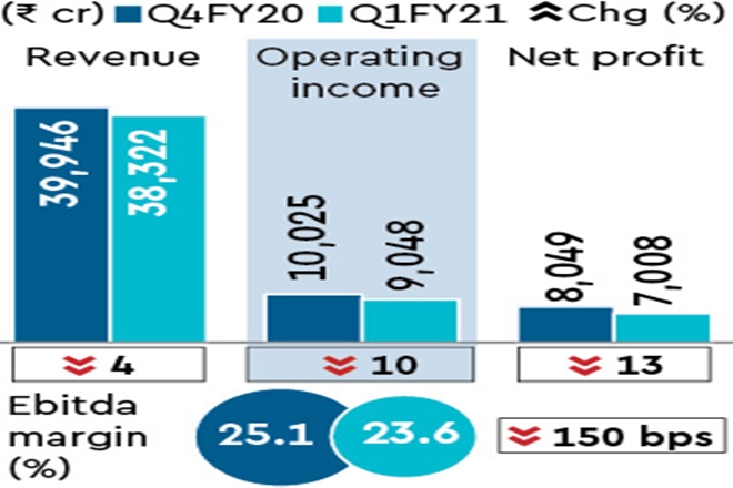 Tata Consultancy Services, the country’s largest software services exporter, reported a sharp contraction in revenues and earnings during the June quarter of the new fiscal, as the Covid-19 pandemic hit hard. The company missed the Street’s estimates on all fronts. Its net profit fell a sharp 13% sequentially to Rs 7,008 crore and missed the Bloomberg consensus estimate of Rs 7,683 crore. Revenues declined 4% sequentially to Rs 38,322 crore, which was also below the Bloomberg consensus estimate of Rs 38,865 crore. Despite the sharp decline in revenues and profit, the TCS management is confident that the situation would turn positive by the third quarter.