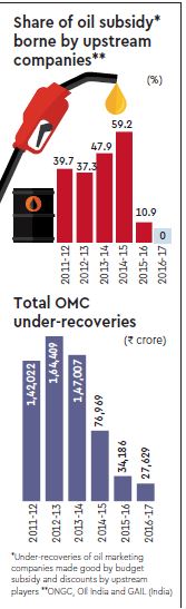 For ONGC, the government’s plan could turn out to be really onerous; the state-run explorer had forked out Rs 56,384 crore in FY14 to mitigate the subsidy burden on the fisc (it was freed from the obligation to give discounts to OMCs in June 2015 and so, its share of subsidy burden disappeared in FY17). Fellow state-run explorer Oil India and gas marketer GAIL (India) also used to share the oil subsidy burden with the government. ONGC, which has a mandate to up capex to increase India’s hydrocarbon output, also contributes in good measure to the exchequer by way of taxes and dividends: In FY17, the company paid a corporate income tax of Rs 7,316 crore and a dividend of Rs 9,518 crore, 68% of which went to the government.