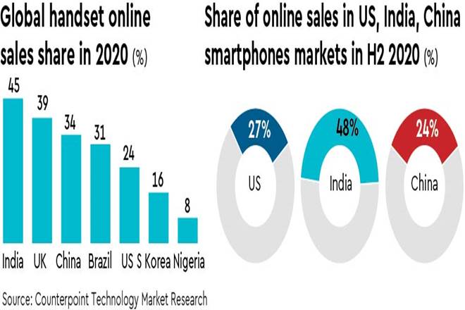 As Covid-19 is affecting the movement of people, shoppers are increasingly turning to e-commerce portals. Counterpoint Research said one in four handsets sold globally was purchased online last year with India accounting for the highest share of online shopping in this category. It is the second consecutive year for the country to lead in online sales of mobile phones.