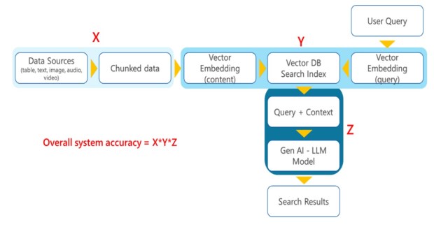 Vectorization: Vector embedding of the chunks is stored in Vector DB and indexes are created for faster search. Vector embedding of the query is also done prior to search. Let’s assume the accuracy of this process is Y.