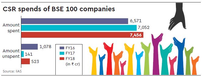 According to proxy advisory firm Institutional Investor Advisory Services (IiAS), the top-100 BSE firms spent more than Rs 21,000 crore on CSR activities between FY16 and FY18. The gap between the prescribed and actual spends by these firms declined from Rs 1,078 crore in FY16 to just Rs 141 crore in FY17 but widened again to Rs 523 crore in FY18.
