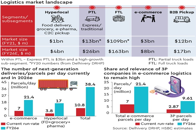 The size of the e-commerce logistics sector is estimated to almost triple to $8 bn by FY26e from c$3 bn at present, HSBC has said, with 3P logistics firms – which manage and deliver other companies’ goods – increasing their market share to 40-50% of e-commerce (from the current around 40% share) benefitting from a) lower delivery costs due to operating leverage and technology investments; b) ability to handle higher seasonal demand; and c) a much better reach vs in-house logistics operations.