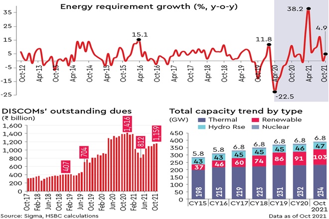 Dues for distribution companies (DISCOMS) continued to mount, rising to Rs 1,159 bn as of Oct’21.