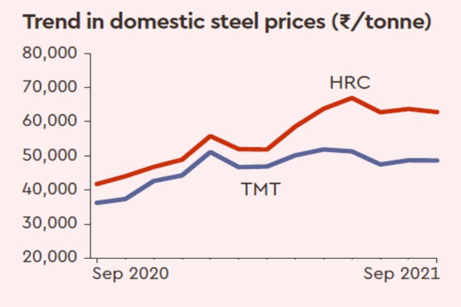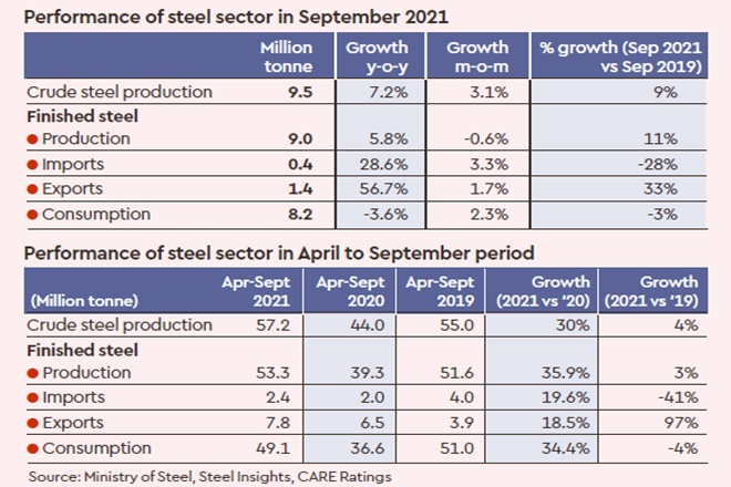 Crude steel and finished steel production during September 2021 stood at 9.5 million tonnes (MT) and 9 MT, respectively, indicating growth of 8.7% and 4.7%, respectively, in y-o-y terms and growth of 9% and 11%, respectively, compared with September 2019.