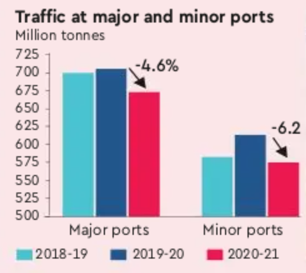The total consolidated cargo traffic handled at the government-run ports (major and non-major) dropped to a three-year low in FY21, contracting 5.3% y-o-y.