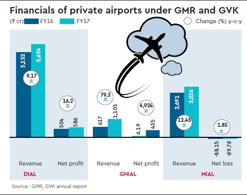 In July 2017, GVK sold the residual 10% stake in Bangalore International Airport (BIAL) to the Fairfax group for Rs 12,90 crore. It had earlier sold a 23% stake in March 2017 for Rs 2,200 crore. In FY17, BIAL reported a 36% jump in net profit to Rs 597.71 crore. GVK has won the bid to develop and operate the Navi Mumbai International Airport which is expected to cost Rs 16,000 crore and be operational from 2020. Meanwhile, the net profit from GMR’s Hyderabad airport (GHIAL) — a joint venture between the Andhra Pradesh government, AAI and GMR — increased a whopping nearly 7,000% during FY17 to Rs 434.19 crore as a result of increase in other income and a check on overall expenses. The revenues increased by 79.3% to Rs 1,105.40 crore when compared to Rs 616.51 crore, driven by a big increase in the number of flights operating from the airport.