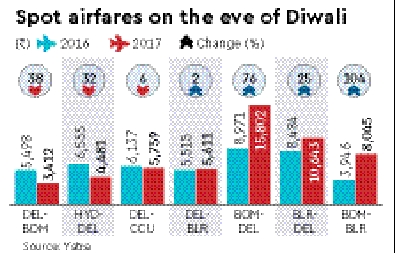 According to data from travel portal Yatra, airfares in the Delhi-Mumbai route shrank by 38% to `3,412 compared to the day before Diwali last year. Ditto on the Hyderabad-Delhi route, which fell by 32% to Rs 4,481, while on the Delhi-Kolkata route, the decrease was comparatively lower, 6% to `5,759. Spot fares on another popular route, Delhi-Bengaluru, have managed to remain flat at Rs 5,611.