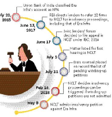 The National Company Law Tribunal (NCLT) on Tuesday ordered the initiation of the corporate insolvency resolution process for Era Infra &Engineering under section 7 of the Insolvency and Bankruptcy Code (IBC). The debt-ridden realty firm, which owes lenders a little over Rs 10,000 crore, was referred to the NCLT by Union Bank of India.