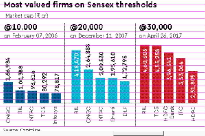 Although the Sensex has closed above the record 30,000-mark for the first time, the excitement was somewhat muted by the absence of any public sector unit (PSU) stock among five most valuable components on the benchmark index. Earlier, when the 30-share Sensex had touched the milestones of 10,000 and 20,000, two PSUs — ONGC and NTPC — had figured on the top-five list.
