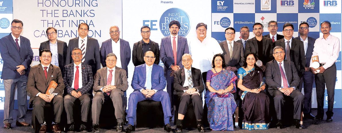 Winners of the FE Best Banks Awards with chief guest Narayanan Vaghul and The Express Group CMD Viveck Goenka