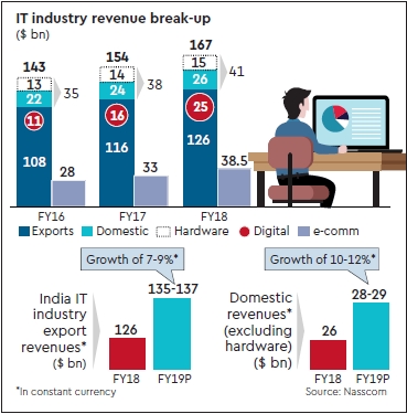 On the hiring front too, there is unlikely to be any significant uptick as the sector is likely to absorb around 1 lakh people in FY19. “Hiring is expected to be similar to FY 2018 with technology jobs in non-technology sectors expected to grow faster,” Nasscom said. In the years prior to FY18, the industry added around 2 lakh people in a year. According to Nasscom, exports are projected to touch $137 billion in FY19, up from $126 billion in FY18. The projections by Nasscom reflect the growth rate of the tier 1 Indian IT services companies such as Tata Consultancy Services, Infosys and Wipro, who have indicated a muted outlook.