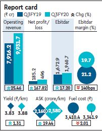Operating revenues were boosted by a 29% growth in ancillary revenues, against a capacity growth of 19%. Cargo uplift grew 46% Y-o-Y in the December quarter, taking its domestic cargo market share to above 40%, compared to 27% a year ago. The management said other ancillary revenues also grew at a faster pace than capacity. Yield for the quarter was up 1.2% Y-o-Y to `3.88, while per passenger revenue grew 5.6% Y-o-Y to `3.91/km. December was a particularly strong month in terms of revenues, Dutta said. “However, as we move to the seasonally-weak fourth quarter, Y-o-Y unit revenue will become more challenging because we will be comparing ourselves against a base period when Jet Airways capacity was beginning to decline.”