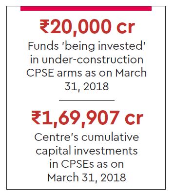The aggregate financial investments in all CPSEs, including under construction CPSEs (comprising paid-up share capital, share application money pending allotment, money received against share warrants and long term loans) grew from Rs 29 crore in 5 enterprises in 1951 to Rs 13,73,412 crore in 339 enterprises as on March 31, 2018. The CPSEs are in the process of investing about Rs 20,000 crore in about 80 under-construction subsidiaries as on March 31, 2018.