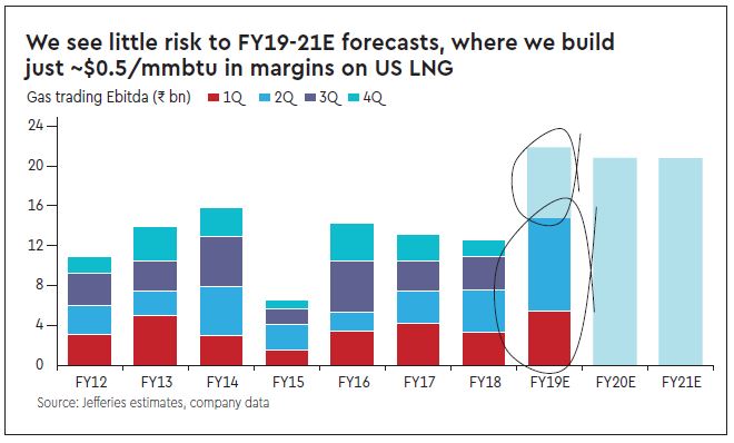 Wane: Trading margins may fall sharply from the Q2FY19 highs, therefore, even if hedges, swaps, lags and lack of detail on contract terms make it hard to pin it down accurately. With LPG/Petchem likely softer in 2HFY19 too, the record Q2FY19 is unlikely to soon be repeated.